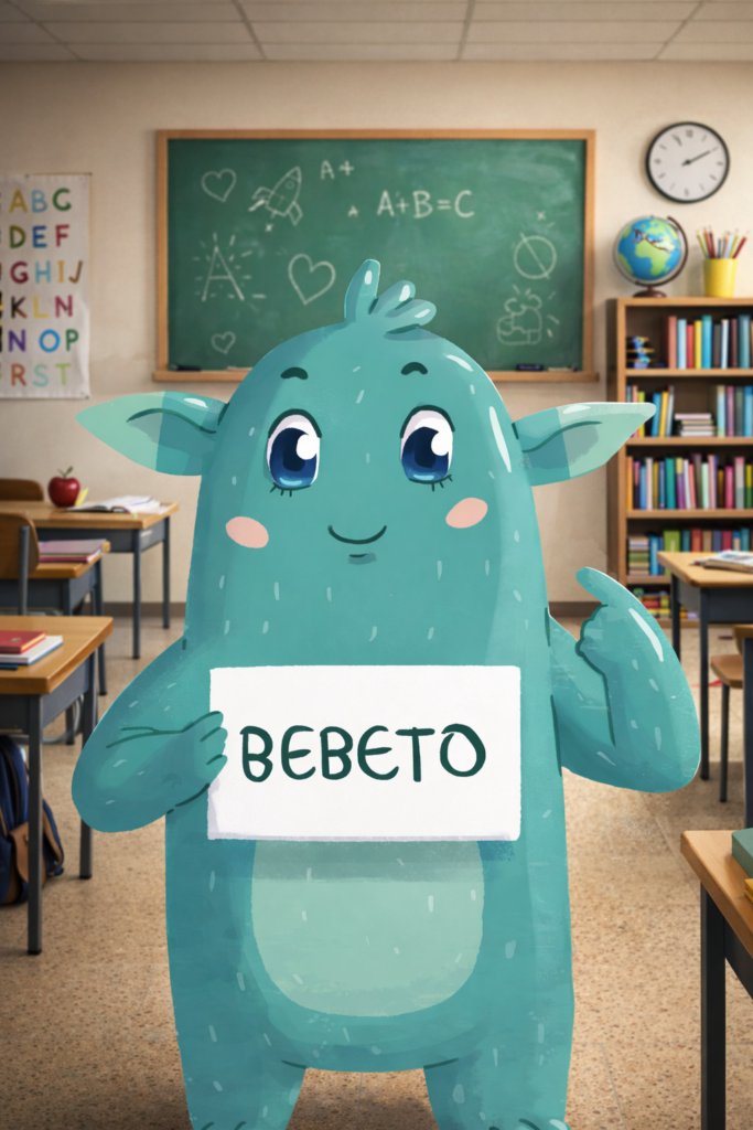 Bebeto é uma mascote lúdica, expressiva e carismática, que aproxima as crianças dos sons do alfabeto de forma significativa.